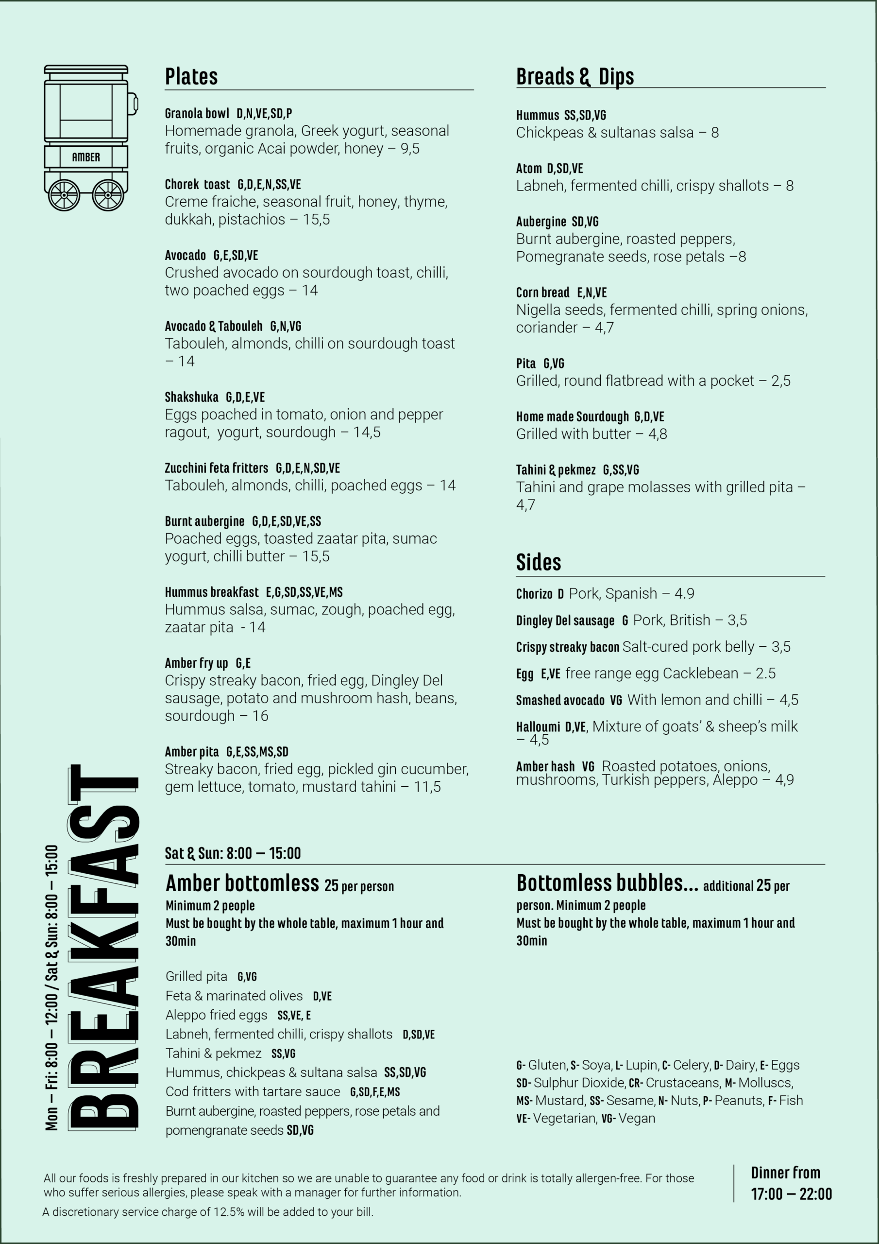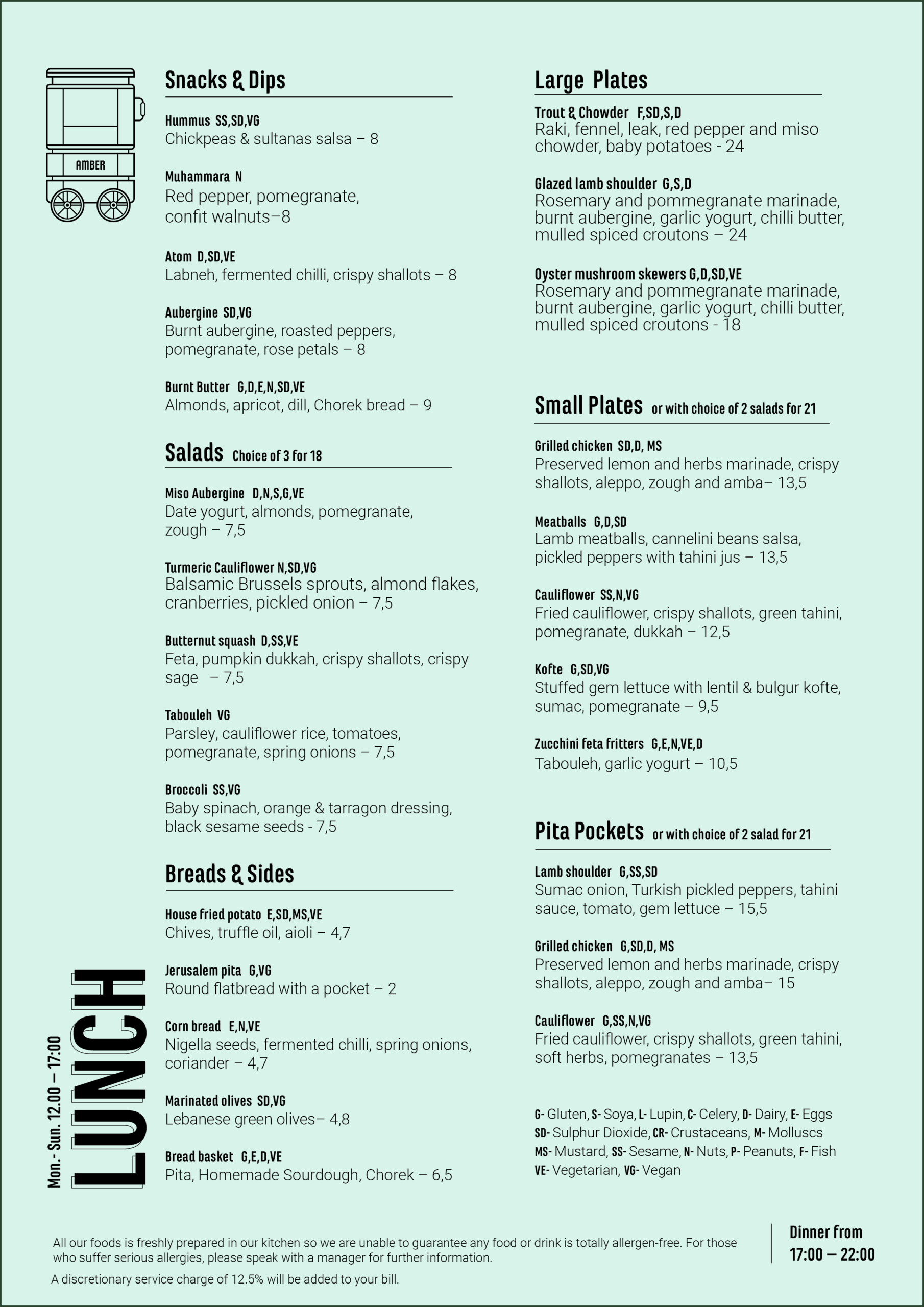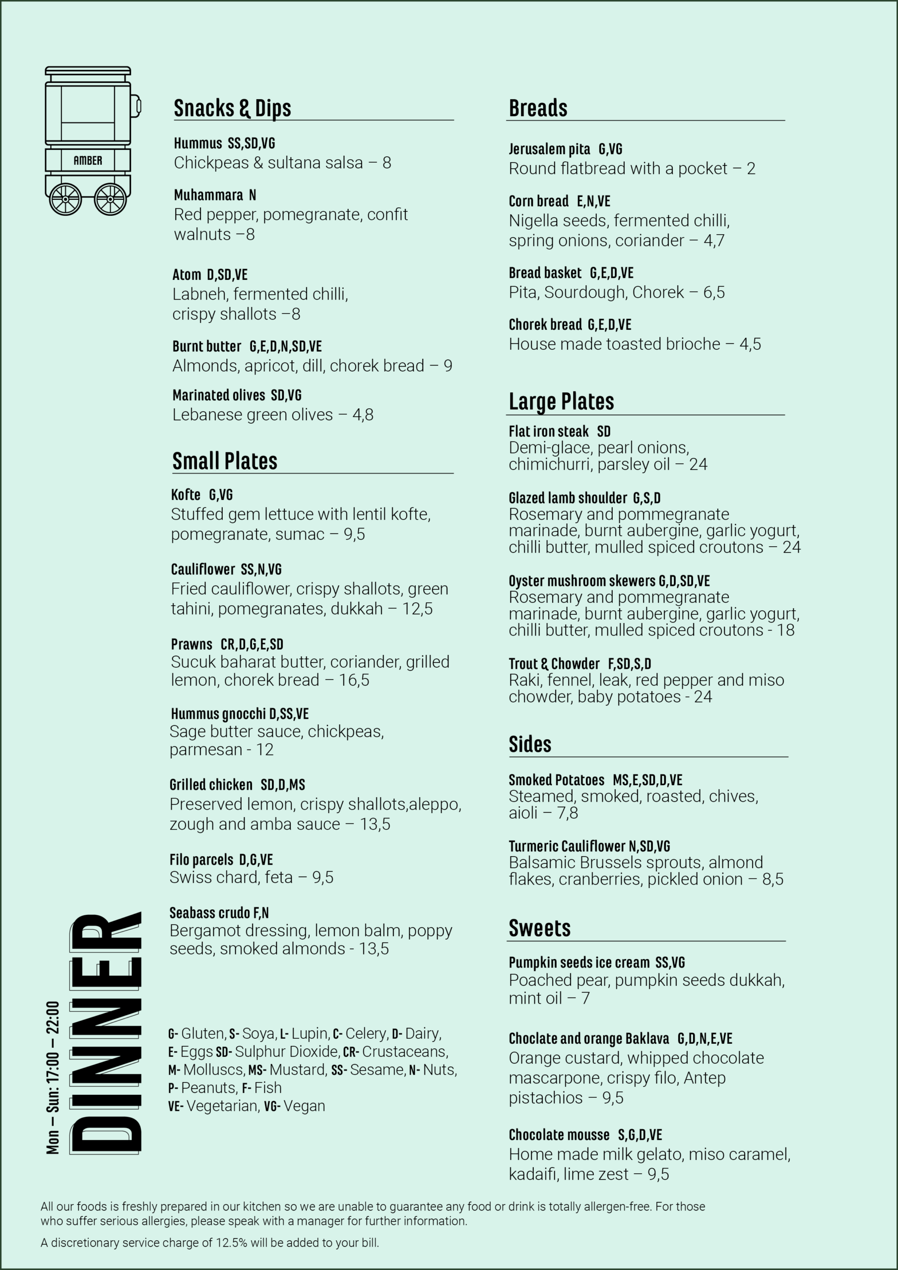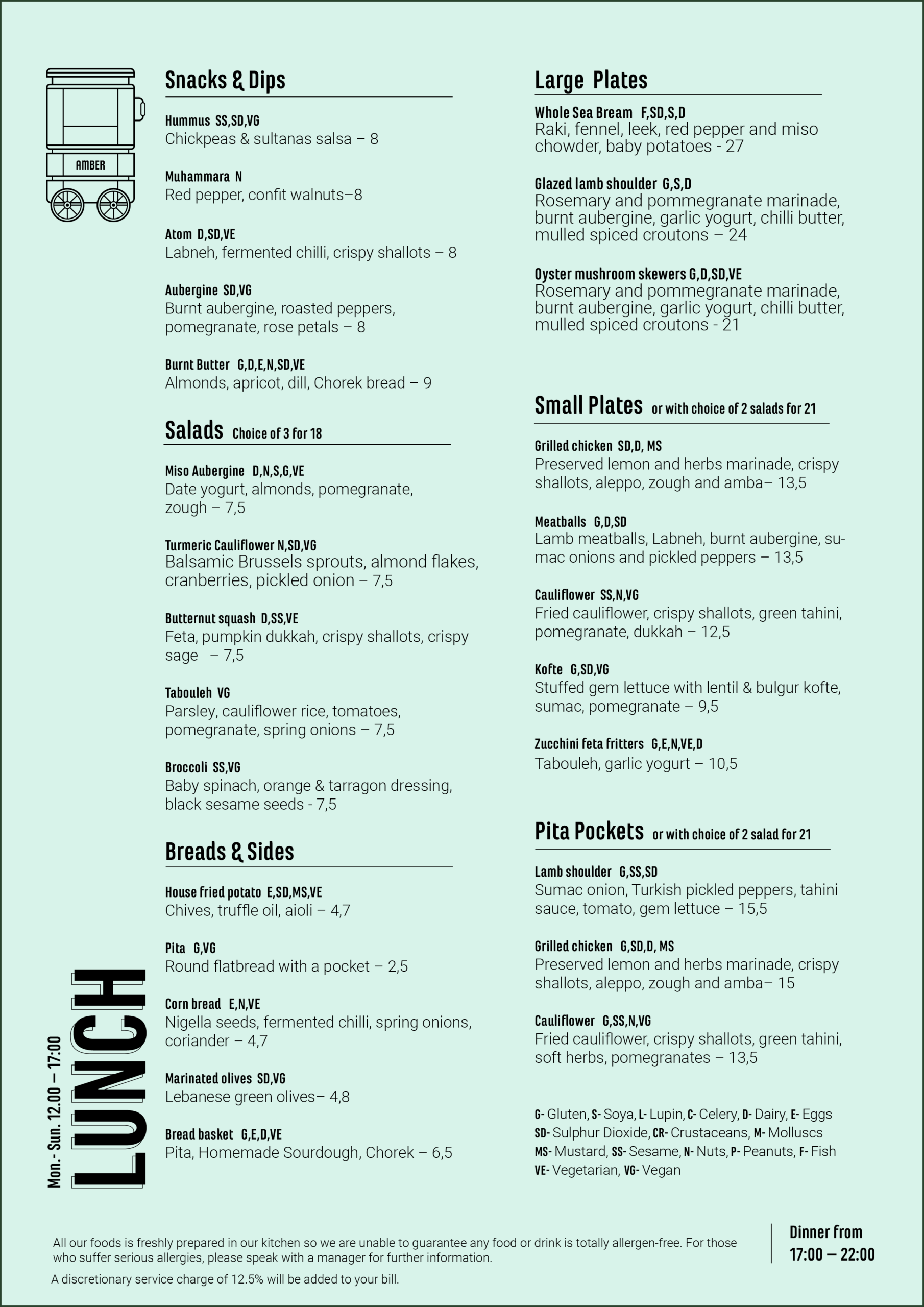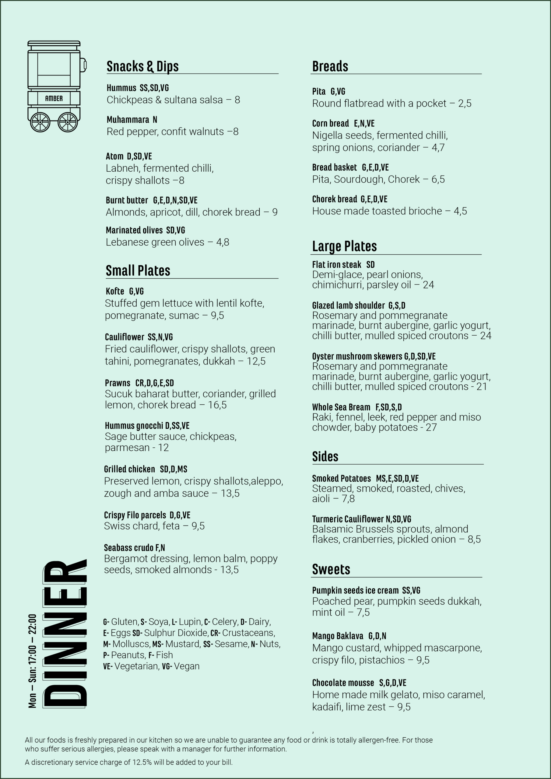 G- Gluten, S- Soya, L- Lupin, C- Celery, D- Dairy, E- Eggs, SD- Sulphur Dioxide, CR-Crustaceans, M- Molluscs, MS- Mustard, SS- Sesame, N- Nuts, P- Peanuts, F- Fish, VE-Vegetarian